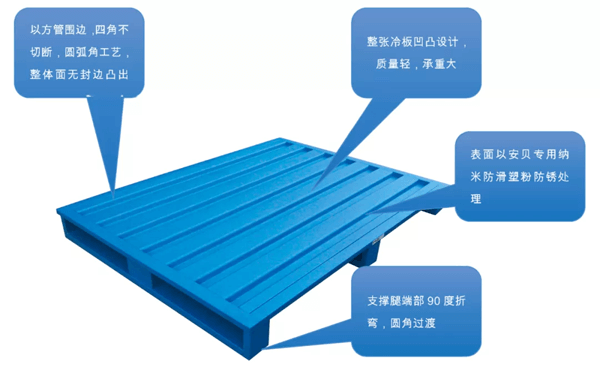 通過生產(chǎn)環(huán)節(jié)對鋼托盤表面處理工藝,有效的對鋼托盤進(jìn)行了防滑處理,真正解決了大量空托盤在自動化立體庫輸送中,因表面光滑導(dǎo)致空盤碼垛運(yùn)行的錯位問題。