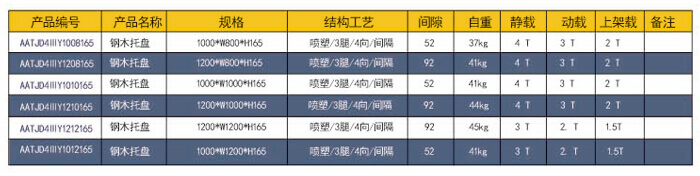 四向三腿——鋼木托盤 技術(shù)參數(shù)說明: 產(chǎn)品編號: AATJD4ⅢY1212165 產(chǎn)品規(guī)格: 1200*1200*165 產(chǎn)品自重: 45kg 防銹工藝: 靜電沙紋噴塑 產(chǎn)品靜載: 3000KG(均勻載重) 產(chǎn)品動載: 2500KG(均勻載重) 產(chǎn)品上架: 1500KG(均勻載重) 主要用途: 倉庫、車間周轉(zhuǎn)、高庫物流倉儲